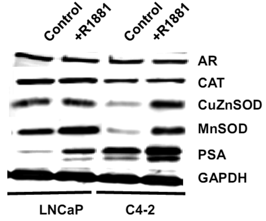 We measured levels of redox-related protein expression after R1881 treatment (Figure 11) and found that MnSOD and CuZnSOD protein expression was increased in LNCaP-C4-2 cells, whereas only MnSOD was increased in LNCaP cells. Since MnSOD and CuZnSOD have dual effects as antioxidant and prooxidant [40], induction of these proteins could possibly be due to an elevation of ROS/RNS. On the other hand, elevation of ROS/RNS after R1881 treatment could be due to induction of MnSOD and CuZnSOD. A shift in prooxidant state by R1881 is also supported by other studies which demonstrated induction of CAT activity and LPO and decrease in GSH [50]. These changes seen after R1881 treatment were likely due to a cellular response to increased production of ROS/RNS. Prostatic specific antigen (PSA) levels were significantly increased in LNCaP cells and slightly increased in LNCaP-C4-2 cells after R1881 treatment (Figure 11). PSA levels were higher in LNCaP-C4-2 cells than LNCaP cells without treatment with androgen, most likely due to constitutive activation of AR in LNCaP-C4-2 cells. Sharifi et al. examined the role of MnSOD in the function of the AR using MnSOD siRNA and found that MnSOD knockout resulted in up-regulation of androgen-regulated gene expression and induction of androgen-DNA binding [53]. Changing redox balance after treatment with R1881 may act as a growth regulator or a growth inhibitor in androgen-responsive prostate cancer cells depending on the cell redox state and concentration of R1881 [50].