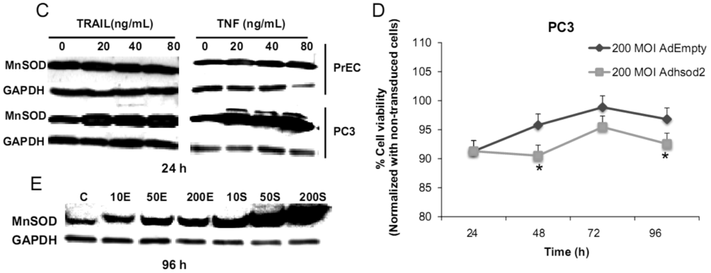 We have challenged PrEC or PC3 cells with TNF or TRAIL to study whether the differences in fundamental redox state of these two cell lines affect cell viability in response to these biologic modifiers. Treatment of PrEC or PC3 cells with 40 ng/mL TNF or TRAIL resulted in alterations in cell viability in comparison to untreated cells (Figures 2A,B). PC3 cells demonstrated more resistance to TRAIL-induced apoptosis than PrEC cells in the first 24 h of incubation. In contrast, TNF induced cell death in PC3 cells more than in PrEC cells at 24 h and 48 h. Induction of MnSOD protein expression levels were observed in PC3 cells treated with TNF or TRAIL at 24 h (Figure 2C). Jones et al. demonstrated that TNF and interlukin-1β induced MnSOD protein expression through NF-kβ in mice [27].