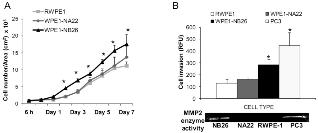 Aggressive cancer cell behavior is determined not only by the rate of cell growth, but also by the in vitro invasive ability of each cancer cell type. Invasion assays were performed to establish that analysis of RWPE1 family cell lines is a suitable model for characterizing cancer cell lines with different levels of aggressiveness. An in vitro invasion assay demonstrated that WPE1-NB26 had more invasive ability than the other two cell lines (Figure 3B).