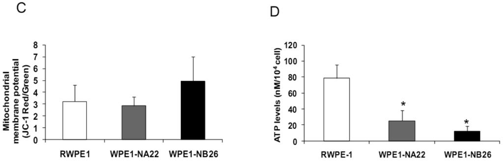 Since invasive ability is correlated with levels of MMP, enzymes whose function primarily relates to degradation of extracellular matrix proteins necessary for cell invasion [36], we performed activity analyses of MMP2 and found that WPE1-NB26 had more MMP2 activity than the other two cell lines. PC3 cells were used as a positive control since it is the most aggressive cancer phenotype used in our current study (Figure 3B). We studied cell metabolic biochemistry and found that RWPE1 cells produced higher levels of ATP, whereas levels of mitochondrial membrane potential using JC-1 (5,5′,6,6′-tetrachloro-1,1′,3,3′-tetraethylbenzimidazolylcarbocyanine iodide) staining were not significantly different in comparison of WPE1-NA22 and WPE1-NB26 cells (Figures 3C,D). The data indicated that ATP levels were at least partially independent of mitochondrial respiration. These combined data suggest WPE1-NB26 cells may have an anaerobic glycolytic phenotype, a feature of highly aggressive cancer cells [21]. Metabolic switch from aerobic to anaerobic pathways concurrent with the progression of cancer also points to the possibility of less ROS production from mitochondrial respiration, which may result in a more reducing environment.