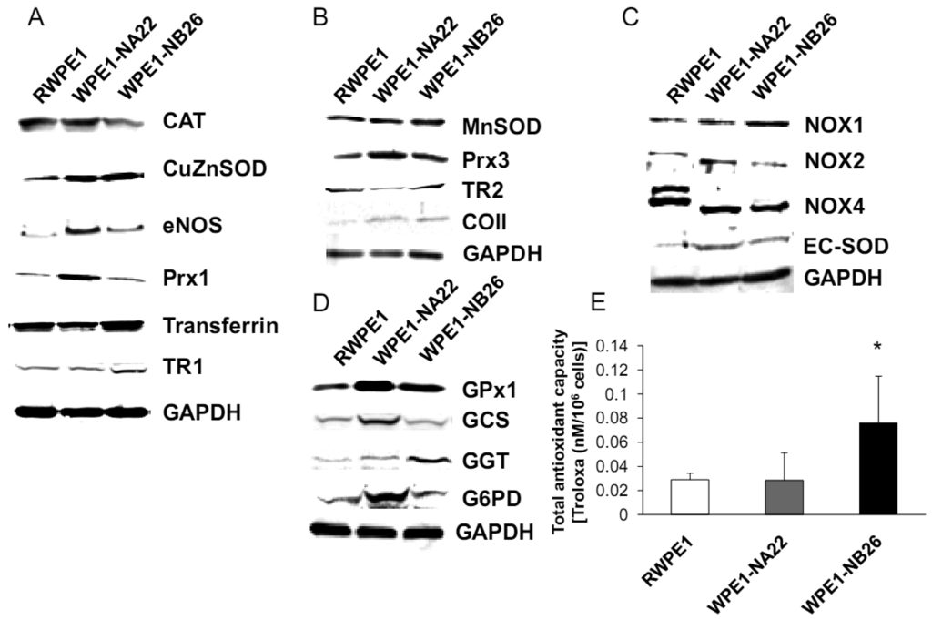 As shown in Figure 5A, CuZnSOD, eNOS, and Prx1 protein levels were increased in WPE1-NA22 cells when compared to RWPE1 cells (P-value ≤ 0.08). High levels of specific antioxidant proteins in WPE1-NA22 cells could possibly be due to high levels of ROS/RNS or redox imbalance in the cells. CuZnSOD was also increased in WPE1-NB26 cells in comparison to RWPE1 cells (P-value ≤ 0.05). The levels of MnSOD, Prx3, and mitochondrial gene cytochrome oxidase subunit II (COII) protein, were slightly increased (P-value ≤ 0.1) in WPE1-NB26 cells in comparison to RWPE1 cells (Figure 5B). It is noteworthy that mitochondria are a major source of ROS production and an alteration in mitochondrial bioenergetics might result from changes in the mitochondrial antioxidant system. Some redox-related protein levels located on the cell membrane (EC-SOD and NOX1) were higher (P-value ≤ 0.05) in WPE1-NB26 than in RWPE1 cells (Figure 5C). These latter data correlated with induction of H2O2 levels in the media [20]. We postulate that higher extracellular ROS/RNS levels observed in WPE1-NB26 cells could be due to higher levels of NOX1. NOX2 and NOX4 isoforms demonstrated a shift in molecular weight in WPE1-NA22 and -NB26 in comparison to RWPE1 cells. Up-regulation of plasma membrane-bound NOX proteins has been demonstrated in several studies and may act as a potential source of increased ROS production [37]. Each cell line expressed different NOX isoforms and protein expression levels. For instance, a series of cell lines developed from the LNCaP cell line (designated as C4-2B cell lines) with increasing metastatic ability also showed increased NOX1 and H2O2 levels. Highly aggressive DU145 prostate cancer cells demonstrated elevation of NOX2 and p22phox [37]. However, only a few studies have measured NOX enzyme activity, so whether or not the NOX family is actually a source of ROS in prostate cancer cells remains unclear [38]. Protein levels are not always equivalent to activity since proteins can be inactivated by ROS/RNS; thus, experiments to evaluate enzyme activity will be necessary to fully understand the significance of changes in protein levels.
