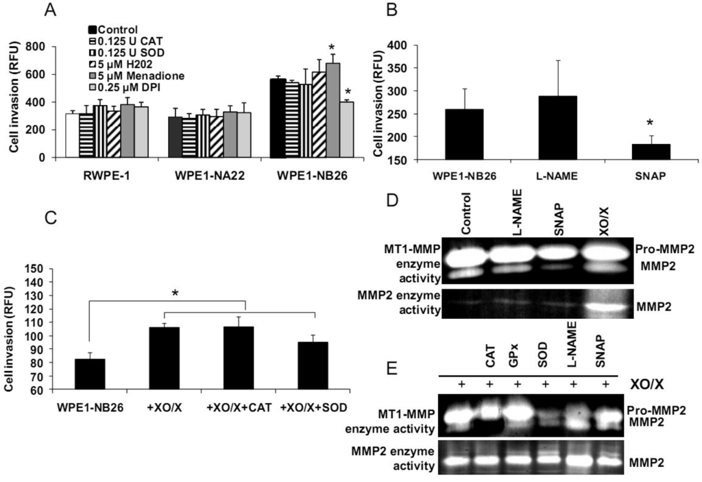 We demonstrated differences of antioxidant and ROS/RNS levels among these cell lines; thus, intracellular ROS/RNS may play a role in prostate cancer cell invasion. To further test this hypothesis, RWPE1, WPE1-NA22, or WPE1-NB26 cells were treated with 0.125 Unit (U) CAT, 0.125 U SOD, 5 μM H2O2, 0.25 μM DPI, 5 μM menadione (O2•− generator), 100 μM NG-nitro-L-arginine methyl ester (L -NAME, nitric oxide inhibitor), 100 μM S-nitroso-N-acetylpenicillamine (SNAP; a •NO donor), or xanthine oxidase (XO)/xanthine (X) (an O2•− generating system) for 24 h, and in vitro cell invasion assays were performed. As shown in Figures 6A-B, menadione treatment significantly increased WPE1-NB26 cell invasion, whereas DPI and SNAP treatment significantly decreased WPE1-NB26 cell invasion. These changes were specific to WPE1-NB26 cells since they were not observed in RWPE1 or WPE1-NA22 cells (Figure 6A). In addition, MMP2 and MT1-MMP activities of WPE1-NB26 cells were significantly decreased after treatment with SNAP, whereas MMP2 activity was significantly increased after treatment with XO/X. We conclude that intracellular redox state regulated invasion of highly aggressive prostate epithelial WPE1-NB26 cells, with O2•− acting as an enhancer and •NO acting as an inhibitor. We performed further analysis by incubation of WPE1-NB26 cells with XO/X ± CAT or SOD for 24 h before invasion assays were performed. As expected (Figure 6C), XO/X treatment significantly increased cell invasion, simultaneous treatment of XO/X with CAT did not change cell invasion whereas simultaneous treatment of XO/X with SOD slightly decreased cell invasion. Treatment with CAT or SOD significantly decreased MT1-MMP activity during XO/X treatment (Figure 6E). Thus, superoxide radical is a key molecule for induction of WPE1-NB26 cell invasion, at least partially through activation of MMP2 or MT1-MMP. These data support the important role of extra-and/or intracellular redox states in aggressive prostate cancer cell invasion, since cell invasion in RWPE1 or WPE1-NA22 cells did not change when treated with the same conditions (Figure 6A).