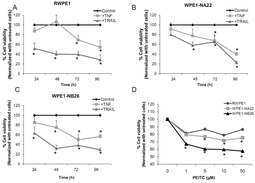 2.2.4. Effects of TNF, TRAIL, or β-Phenethyl Isothiocyanate (PEITC) on RPWE1, WPE1-NA22, or WPE1-NB26 Cell Viability
