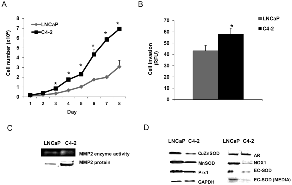 We analyzed biologic behavior and redox biochemistry of the less aggressive LNCaP prostate carcinoma cell line in comparison with the more aggressive LNCaP-C4-2 prostate carcinoma cell line. These initial tissue culture studies were performed in the absence of androgen. As shown in Figure 8A, the results demonstrated that LNCaP-C4-2 cells grew faster than LNCaP cells. LNCaP-C4-2 cells had greater invasion ability through Matrigel matrix basement membrane when compared with LNCaP cells (Figure 8B), correlating with higher levels of MMP2 protein and activity (Figure 8C). To better understand redox differences between these two cell lines, various redox-associated proteins were analyzed by western blotting using specific antibodies. Western blot analysis of redox-related proteins indicated that LNCaP cells had greater levels of certain antioxidant proteins; CuZnSOD, MnSOD, and Prx1 (Figure 8D). Furthermore, total SOD, MnSOD, and EC-SOD enzymatic activities in LNCaP-C4-2 cells were lower than LNCaP cells (data not shown). Lower levels of MnSOD protein were often found in malignant tissues of primary cancers compared to corresponding non-tumor tissues [18,39]. As mentioned earlier, SODs have dual effects as antioxidant and prooxidant; lower levels of SODs in more aggressive prostate cancer cell lines may be a compensatory mechanism to lower oxidative stress levels due to the prooxidant effect of SODs.