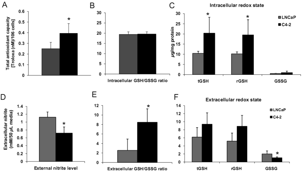 The present study focused on intra- and extracellular redox states in normal/immortalized prostate epithelial cells and specific prostate cancer cell lines.