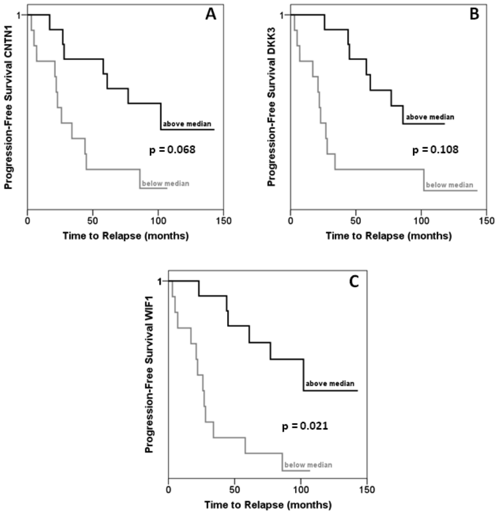In the same set of samples, expression of DKK3, WIF1 and CNTN1 was observed to be significantly decreased (Figures 2A–C). Expression of each gene correlated inversely with that of HOXC6 in a statistically significant (each p < 0.001) manner (Figures 2D–F). Accordingly, expression of each target gene correlated significantly positively with that of each other, with Spearman rho coefficients between 0.4 and 0.6. Cases with lower than median expression of each target gene, CNTN1, DKK3 or WIF1, showed earlier recurrence, but the association was only significant at the p < 0.05 level for WIF1 (Figures 3A–C). In addition, low WIF1 expression was significantly associated with lymph node involvement (p = 0.036) and higher Gleason scores (p = 0.026), but not with tumor stage (pT2 vs. pT3). Expression of CNTN1 or DKK3 was not significantly associated with any histopathological parameter in our series.