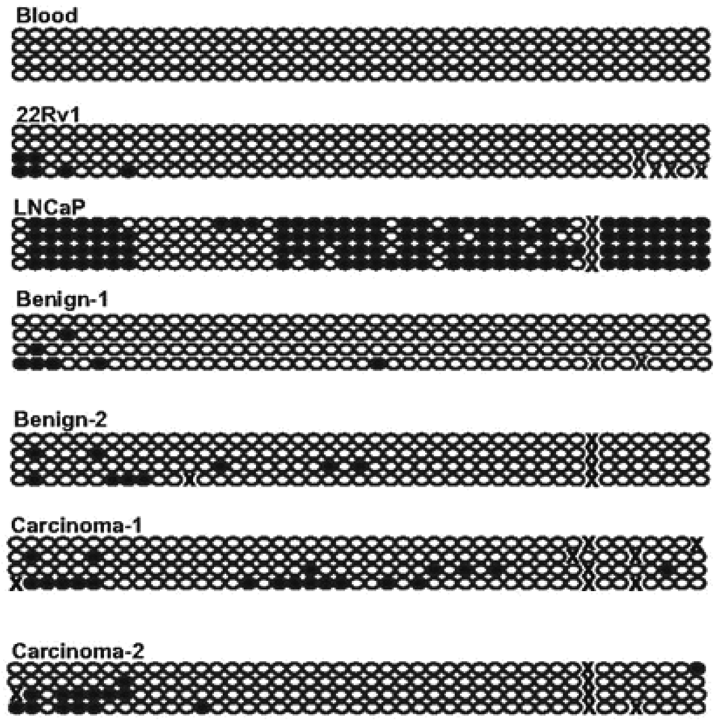 Methylation of DKK3 and WIF1 promoter CpG-islands was analyzed by methylation-specific PCR as described in previous publications [21,29]. Methylation of DKK3 was observed in 16 of the 92 carcinoma samples, but not in benign controls. It was significantly more frequent in cases with lymph node involvement and significantly less frequent in cases with Gleason score < 6 (χ2 test, p < 0.05). However, expression of DKK3 was not significantly different between carcinoma samples with or without hypermethylation. WIF1 methylation was more prevalent, being detectable in 31 of 92 carcinoma samples, but also in eight of 17 benign controls. The latter finding may relate to previous findings [18] suggesting that WIF1 downregulation may commence at early stages of prostate cancer. As for DKK3, WIF1 hypermethylation and the extent of downregulation of expression were not significantly related to each other. Because the bands obtained in the WIF1 MS-PCR assay with the methylated-specific primers were often weak (except in LNCaP cells used as a positive control), bisulfite sequencing was conducted across the region interrogated by the assay in prostate tissue samples and controls (Figure 4). The analyzed part of the WIF1 CpG-island was completely unmethylated in blood leukocytes, but was quite densely methylated in the prostate cancer cell line LNCaP which lacks WIF1 expression. In contrast, only occasional sites were methylated in the expressing 22Rv1 line. In all benign and carcinoma tissues, only patchy and weak methylation was found, as suggested by the results of the MS-PCR assay. Of note, we have previously shown that in this set of prostate cancer tissues GSTP1, EPB41L3 and several other genes are each hypermethylated at frequencies of 60%–80%, often displaying dense methylation [19,30]. Thus, DKK3 and WIF1 hypermethylation was much less widespread than downregulation and was often weak if it occurred.