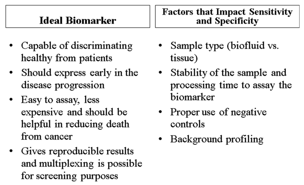Although we describe individual biomarkers in the following section and Table 1, the specificity and sensitivity of diagnosis is optimum when several biomarkers are used in combination [39]. Before making a decision about disease pathogenesis, a patient's family history and lifestyle should be taken into account. The characteristics of an ideal biomarker and factors that influence the specificity as well as the sensitivity of a biomarker are shown in Figure 2.