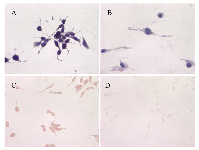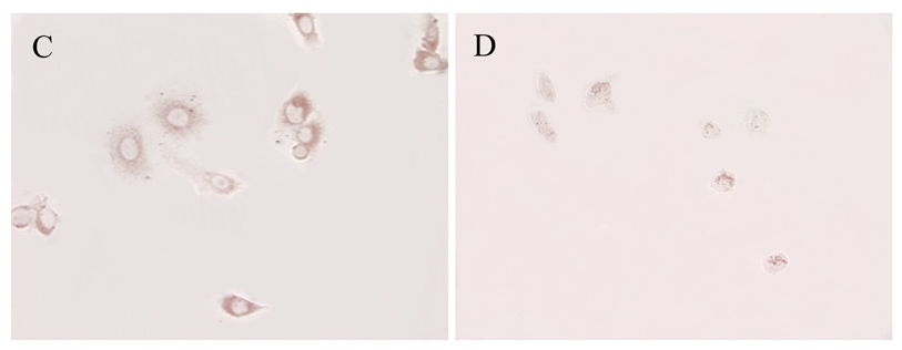 ATIP protein expression was examined in fixed whole LNCaP and PC3 cells where it was localized to the cytoplasms of both cell lines (Figures 1 and 2). There was no staining (negative-control) in prostate cancer cells when the ATIP anti-body was pre-absorbed with ATIP antigen (Figures 1B,D and 2B,D).