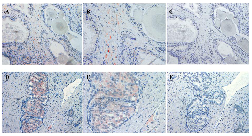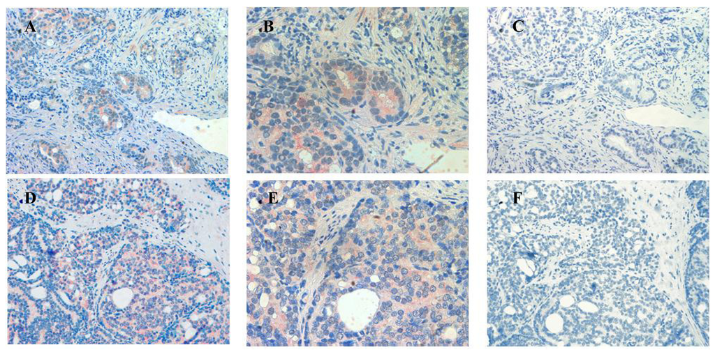 Little or no ATIP staining was detected in prostate tissues in negative control experiments, in which the primary antibody was pre-absorbed overnight with the ATIP antigen or when the primary antibody was replaced with PBS (Figures 4C,F,I).