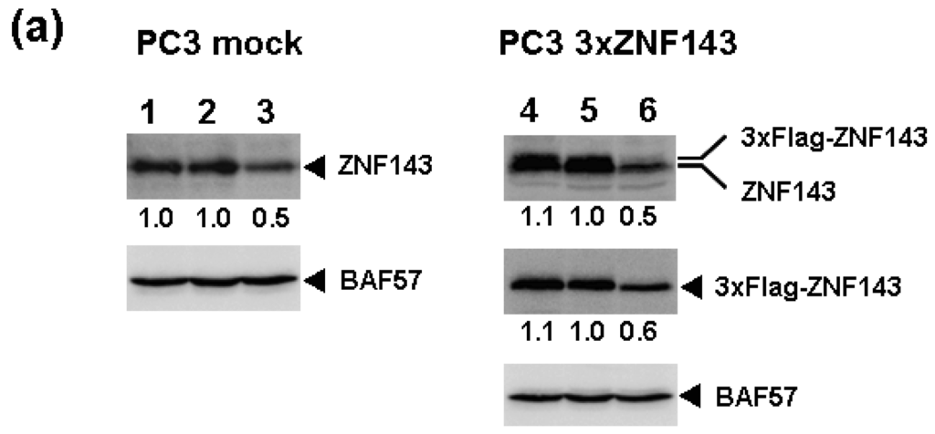 Establishment and cloning of PC3 cells with forced expression of ZNF143 by transfection with 3xFlag-ZNF143 expression plasmid was described previously [8]. PC3 mock cells were transfected with empty expression plasmid and selected by hygromycin without cloning.