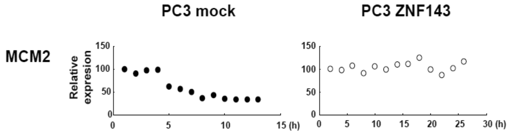 We also previously reported that ZNF143 expression is induced by DNA-damaging agents, and is overexpressed in cisplatin-resistant prostate cancer PC3 cell lines [7,8]. However, the proliferation rate of the cisplatin-resistant cell lines is generally slower than that of its parent cell line. To assess the effect of ZNF143 expression on the cell cycle, we established PC3 cells with forced expression of ZNF143, and investigated protein expression associated with cell division, as well as ZNF143 expression according to cell cycle phase. The proliferation of PC3 cells with forced expression of ZNF143 is much slower than that of its wild-type counterpart cell line, and nuclear expression of several MCMs between these cells is different. We hypothesize that the expression cycle of ZNF143 is associated with cell division.
