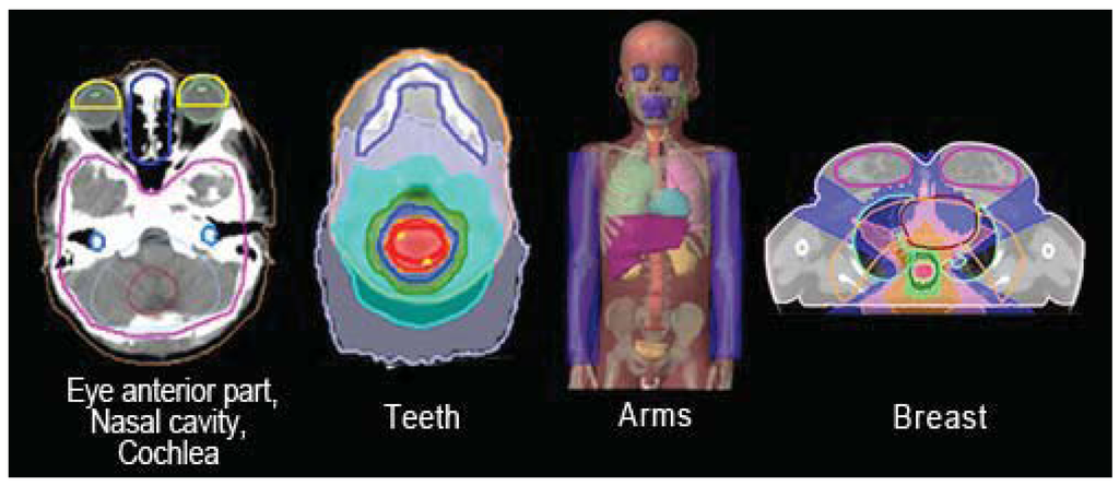 One of the fundamental prerequisites for conformal RT and especially for all IMRT techniques is the localization of the target, starting with the gross tumor volume (GTV) and the clinical target volume (CTV), and moving outwards to the PTV. Inverse planning for IMRT-HT requires comprehensive contouring of all OARs. The CT images are acquired from a slice thickness and spacing of 5 mm. A 2.5 mm slice thickness CT is used for brain and head and neck targets. In our practice, the volume of interest is generated with a co-registered CT/MRI (magnetic resonance imaging) ± PET (positron emission tomography); starting with a multimodality diagnostic imaging set, we delineate the target and OARs, and next we proceed with treatment planning optimization. Some extra structures are generated (“tune structures”) to obtain a better optimization around the target which include e.g., the anterior part of the orbits, the nasal cavity, the jaw-maxillary-dental area, the arms, and the breasts (Figure 1). The spinal cord when considered as OAR is always contoured and automatically expanded with a 1 cm margin to create the “spinal cord tuning,” which better spares the organ.