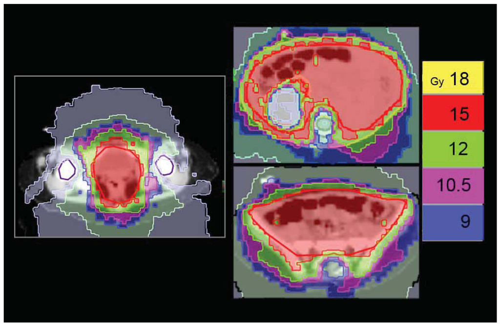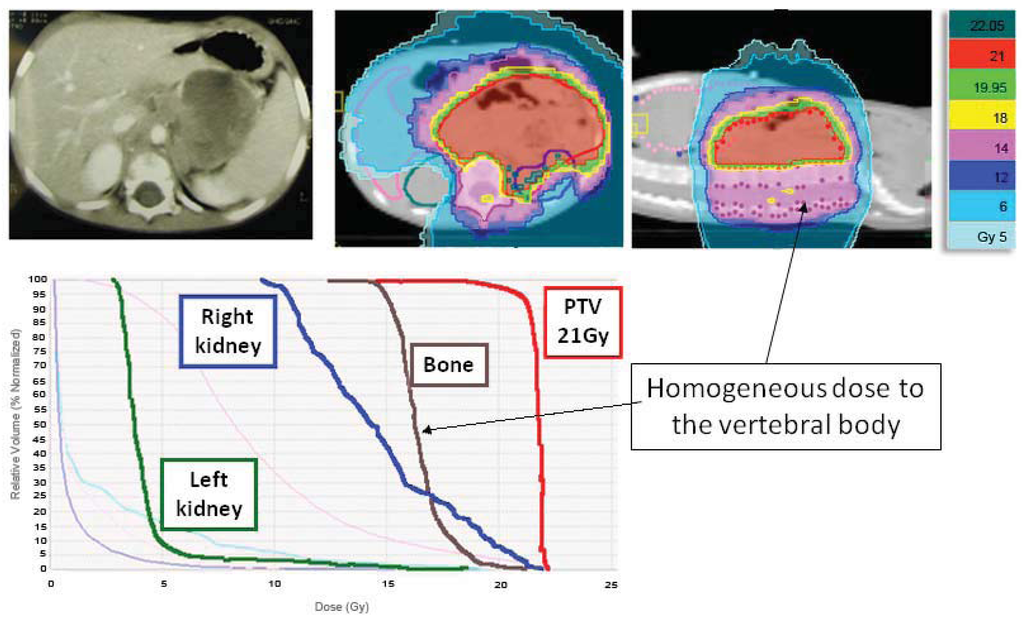 Beyond a better control of the PTV dose coverage, HT enables us to further reduce small bowel dose to avoid any serious acute lower gastro-intestinal toxicity, while achieving a very homogenous dose along the vertebral body (Figure 9). In addition, there is a greater homogeneity in whole abdomen irradiation with concomitant sparing of the healthy kidney (Figure 10), which is also shown in other studies [26,27].