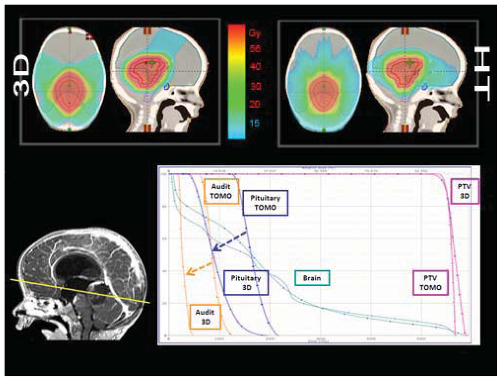 Structures contoured as OARs for the brain patient group were both parotids, teeth, the mandible (including temporo-mandibular joint), the spinal cord, optical structures (optical nerves, chiasm, eyes, lens), the brain, the brain stem, the pituitary gland, temporal lobes, the cochlea, and the thyroid gland. The choice of sparing one organ‘more than another’ is a complex clinical and technical challenge. The use of delivery systems with a very high degree of freedom, such as HT, could permit us to explore the potential of sparing other structures and tissues that normally cannot be efficiently spared with more conventional 3D-CRT or IMRT techniques [9]. Examples of OARs are the cochlea and the pituitary gland in the treatment of the brain. Much importance is given to the prevention of hearing loss as it could compromise the quality of life of these young and very young patients, especially in the workplace and during social relations. Despite its small size (mean volume 0.14 cc), the cochlea is easily identified on CT planning with 3 mm cut [10]. We slightly expanded the anatomic cochlea contour as an OAR to facilitate its preservation from excessive radiation because of its small size. In fact, the value of data resulting from HT planning optimization is not so accurate for OARs whose volumes are lower than 2 cc. Neuroendocrine disturbances in anterior pituitary hormone secretion are common following radiation damage, the severity and frequency of which correlate with the total radiation dose delivered to the hypothalamus-pituitary axis and the time that has elapsed since treatment. Classically, growth hormone (GH) is the most sensitive of the anterior pituitary hormones to irradiation, followed by gonadotrophins, adrenocorticotrophic hormone (ACTH) and thyroid-stimulating hormone (TSH). The somatotrophic axis is the most vulnerable to radiation damage and GH deficiency remains the most frequently seen endocrinopathy. In our example of a 2-year-old male with an atypical teratoid rhabdoid tumor of the quadrigeminal region, the HT plan has been compared with 3D-CRT using no-coplanar fields. The tightly conformal dosimetric characteristics of HT were not advantageous with respect to the cochlea and pituitary gland DVHs. In this case, the relatively small volume of treatment, the regular target volume and the opportunity to choose the entrance fields with CRT, favored applying the latter option (Figure 2). Some patients with brain tumors need CSI and, in this case, HT has a frequent application. In our experience in a 4 year-old-male affected by medulloblastoma treated with HT (Figure 3), an inspection of DVH reveals excellent conformal quality both for CTV brain and spinal cord with better sparing of OARs close to the target [7]. In comparison with conventional techniques, CSI delivered with HT is able to achieve better dose homogeneity and conformality in the target volume. With HT-CSI lower doses are distributed to larger volumes and higher doses to smaller volumes, with higher doses confined to a very small volume. The potential drawback of the low dose bath is that it could have an effect on acute toxicities (e.g., on the lung, on the gastrointestinal tract) and on the total body ID [7].