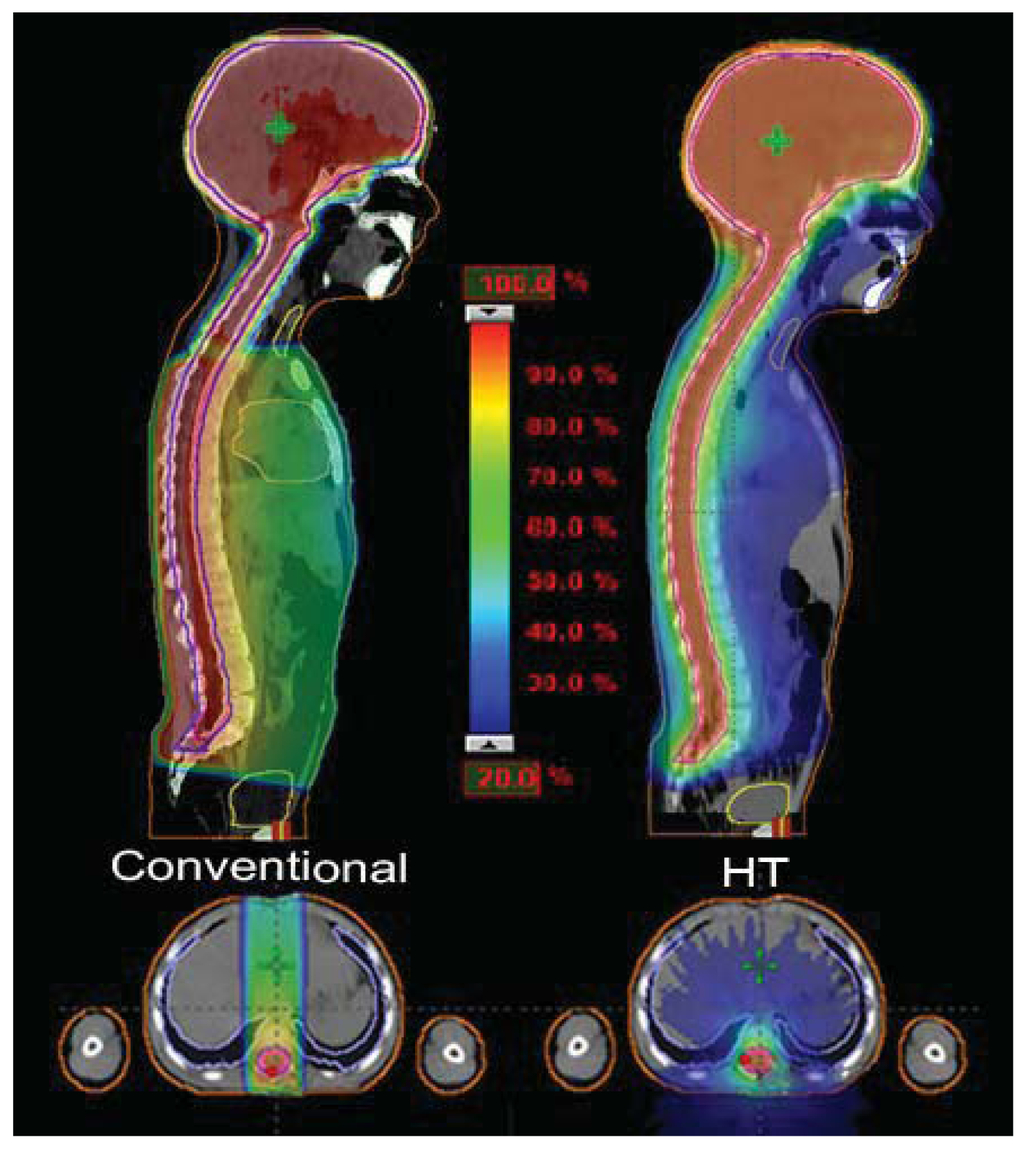 Finally, HT gives us the opportunity to re-treat areas that have been already treated. The advantages for re-treatment with HT are the greater conformality of dose distribution and the possibility to respect dose constraints for adjacent, critically sensitive, previously irradiated normal tissues. This opportunity could be of interest both for palliative intent and for patients in which curative treatment could not be obtained with other procedures. We use HT for the re-treatment of local relapsed brain tumors and “in field” relapsed Hodgkin lymphomas. Both these situations can adequately be managed by other techniques like Linac-delivered IMRT or stereotactic treatment. An unusual condition in which HT can play a specific role is the re-irradiation of the craniospinal axis. We employed this technique in a 10-year-old male with diffuse meningeal spread of disease, 24 months after the first-line CSI for a standard risk medulloblastoma, proved to be refractory to salvage chemotherapy. He received 23.4Gy in 13 fractions to the craniospinal axis, with a reduced dose to posterior fossa of 18Gy. HT allowed us to adequately re-treat the entire axis, while giving a safe dose to the posterior fossa, previously treated by the full dose (55.8Gy).