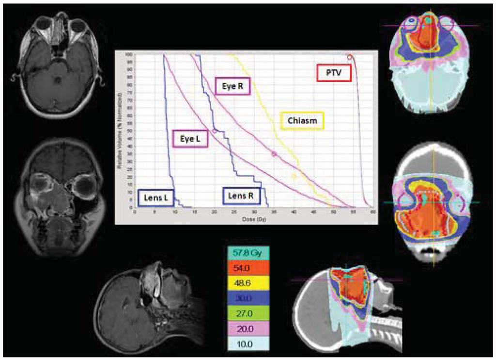 In our patients with head and neck tumors the use of HT, as an alternative to 3D-CRT, was chosen to avoid multiple fields, different energies, and junctions and to spare unavoidably higher dose to the optic nerves, chiasm, eyes and lens, as shown in our adolescent patient affected by esthesioneuroblastoma of the nasal cavity (Figure 5). HT gives us the opportunity to “paint” the high-dose region around the target volume and thus spare at least part of the mucosa from the high-dose region.