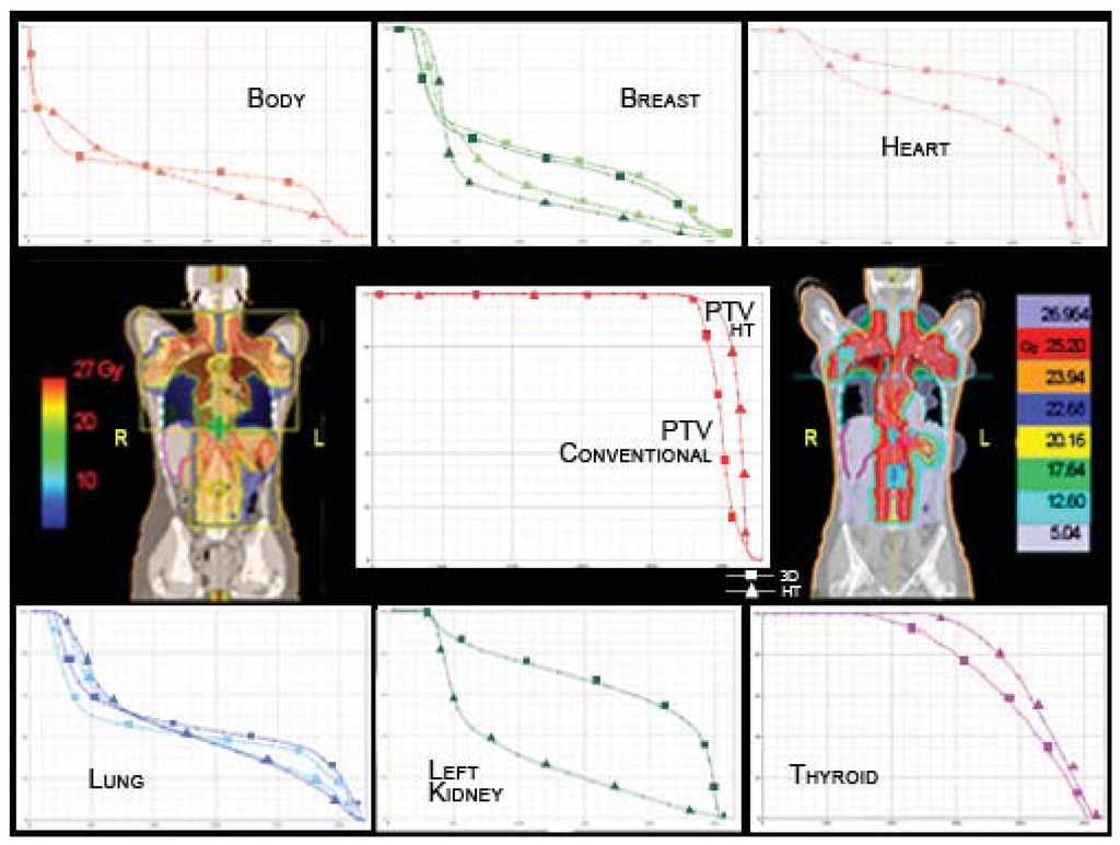 RT for advanced Hodgkin Lymphoma (HL) often requires large fields and may result in significant exposure of normal tissues to ionizing radiation. Advances in the treatment of HL have resulted in a large number of long-term survivors at risk for the serious late effects of therapy. Currently, second cancers are also the primary cause of mortality among these patients with breast cancer being the most common solid tumor among women. The largest excesses of breast cancer are observed among women diagnosed with HL at age 30 years or younger, a pattern that is consistent with the known radio-sensitivity of the breast at young ages [20]. The incidence of breast cancer has been reported to increase by a factor of 4.3 (95% CI: 2.0–8.4) for patients treated with mantle irradiation [21]. While the dose response for radiation above 10Gy remains uncertain, carcinogenesis after radiation is exacerbated by the large dose gradient across the breast and treatment field position. Although HT might significantly decrease high doses delivered to the breast, it increases the volume that receives lower doses, which has also been implicated in the carcinogenesis process [22]. Conventional 3D-CRT delivered with opposite anterior-posterior fields has been successfully used to treat this disease but treatment delivery often requires photon-photon or photon-electron matching, utilization of field-in-field techniques and partial transmission blocks [23]. Dose reduction in the thyroid, breast, but also in the heart, kidney and bowel should be helpful. Based on our experience, HT obtains a greater dose homogeneity in the PTV and has dosimetric advantages compared to the conventional technique in several OARs. The most striking results have been obtained for the left breast (10.82Gy and 7.9Gy mean dose for 3D-CRT and HT, respectively), the right breast (10.13Gy and 8.73Gy mean dose for 3D-CRT and HT, respectively), the heart (19.89Gy and 17.1Gy mean dose for 3D-CRT and HT, respectively), and the left kidney (17.9Gy and 8.9Gy mean dose for 3D-CRT and HT, respectively) (Figure 7). To achieve these results we did not perform a full blocking of the structures. We applied a high importance with a very low dose constraint to the specific OAR. In our cases, this approach allowed us to achieve analogous results to full blocking, but with better optimization of the target. Instead, we use a directional block e.g., in total pleural irradiation to spare the contralateral lung and in CSI to avoid irradiation through the arms.