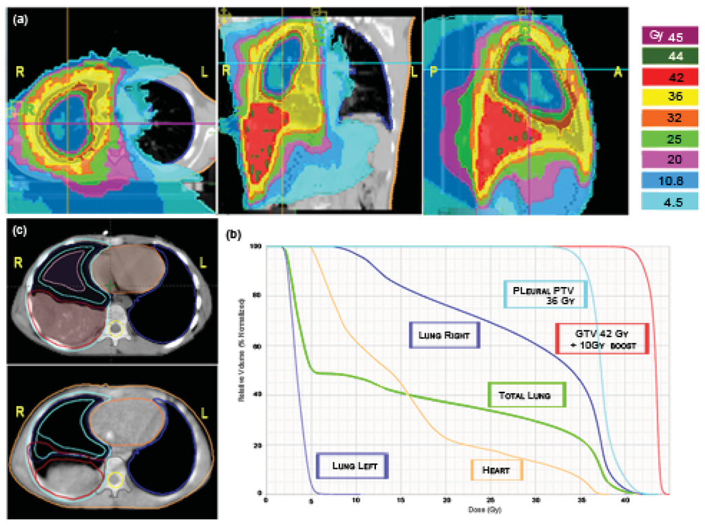Irradiation of the pleural cavity represents a special challenge for radiotherapists because every conventional technique determines the risk of delivering high doses to the involved lung. Even if this treatment is mostly applied in the adult population with mesothelioma, sometimes also pediatric age cases of soft tissue tumors can involve the entire pleura. We applied HT to an adolescent patient affected by PNET (primitive neuroectodermal tumor) of the right pleural cavity with multiple nodular localizations and, after chemotherapy, a residual bulky disease along the base of the diaphragm. The patient was simulated in a supine position with arms overhead and fixed with a vacuum bag. The prescription to the right pleural PTV was: first phase, 36Gy in 20 fractions with a simultaneous integrated boost of 42 Gy in 20 fractions to the post-chemotherapy residual disease [Figure 8(a)]; second phase, 10 Gy in five fractions (total dose 52 Gy) delivered only to the shrinking residual costal-diaphragmatic tumor [Figure 8(c)]. The planning was built with the following constraints: mean total lung dose <20 Gy; V20 Gy total lung <30–35%; left healthy lung, all volume <15 Gy, V5 Gy <50%; heart V 20Gy <50%. A tune structure was built in the central part of the affected lung with a dose constraint of 20 Gy [24]. The result was quite good both in terms of PTV coverage and the sparing of the contra-lateral lung and other OARs [Figure 8(a)]. The mean total lung dose and the V5 Gy were 15.9 Gy and 50%, respectively. The mean dose for the affected lung was 29.1 Gy. The maximum dose, the mean dose and the V5 Gy for the healthy lung were 10.5 Gy, 3.4 Gy and 3.8%, respectively. The maximum dose, the mean dose and the V20 Gy for the heart were 38.2 Gy, 15.5 Gy and 22%, respectively [Figure 8(b)]. The plan was initially defined on the basis of pre-RT imaging, but this could not accurately reflect the degree of normal lung exposure during all treatment. For this reason, while monitoring tumor shrinkage with daily MV-CT, we planned the second treatment phase on the basis of MV-CT acquisition, applying an adaptive therapy to try to further reduce any exposure to the normal lung [Figure 8(c)]. The patient is in complete remission after 42 months from end of RT. He developed a transient radiation pneumonitis in the right lung during the first year, requiring steroid support.