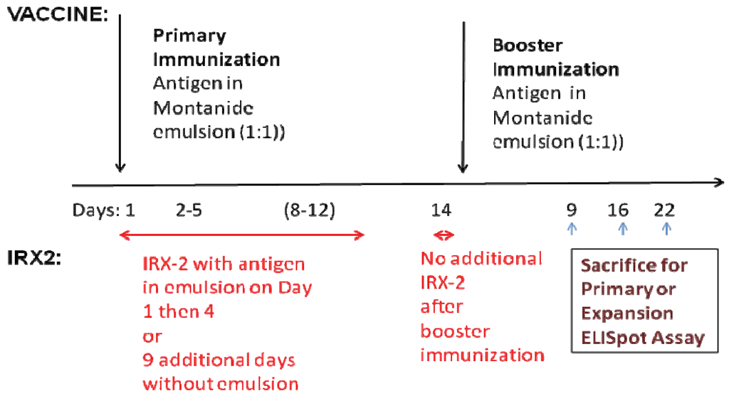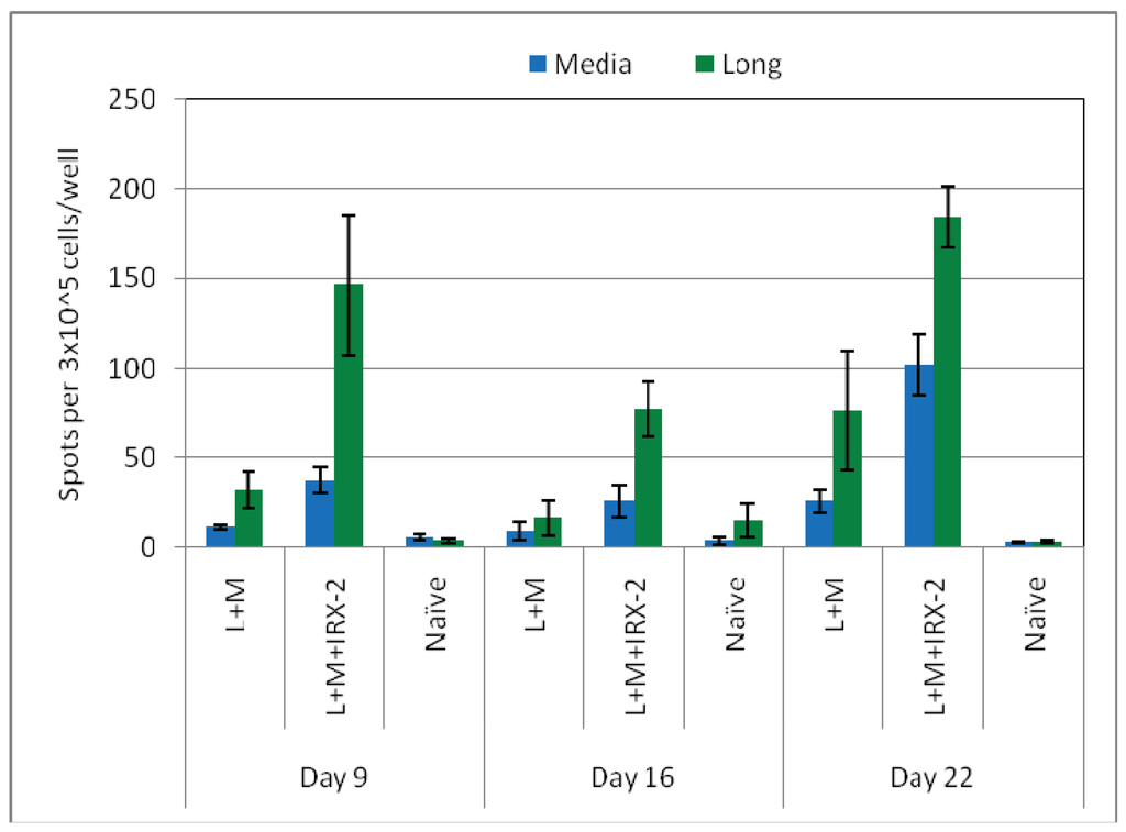 Mice not receiving the IRX-2, had VIVO-10 ™ media substituted as a control containing no cytokines. Booster immunizations with antigen plus adjuvant were given on day 14 but additional daily injections of IRX-2 were not given along with the booster immunizations. Multiple experiments were performed at different times post booster immunization and the data presented is representative of those experiments. Since the ELISpot assays have a variable response on different days, these studies do not demonstrate kinetics of the response as that would require staggered starts for the immunizations and sacrificing of mice at various times post boost on the same day.