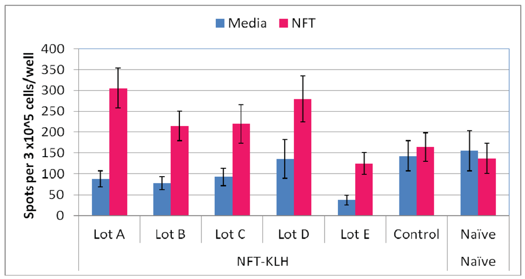 IRX-2 enhances the activity of APCs and T cells in both in vitro and in vivo assays [12-15]. IRX-2 is also an effective adjuvant for various vaccine delivery systems providing the rationale for further studies with a variety of vaccine candidates [9,12]. For example, mice immunized with IRX-2 and the mouse T cell dominant peptide from human PSMA consistently showed increased T cell activity in lymph node and spleen lymphocytes compared to no IRX-2 [12]. This was true for both the peptide administered with Montanide and the peptide conjugated to KLH and given without Montanide. Figure 2 presents data using the PSMA peptide (NFT) conjugated to KLH as the vaccine, administered with any of five different lots of IRX-2. The protocol was similar to that described in our previous paper (and in Figure 1). An enhanced antigen specific T cell response of the lymphocytes from the immunized mice as defined by the ELISpot assay (where the background signal was subtracted) was observed with all lots of IRX-2. The positive antigen specifiic response was compared to both a control preparation consisting of the protein matrix without cytokines and to naïve (non-immunized) mice.