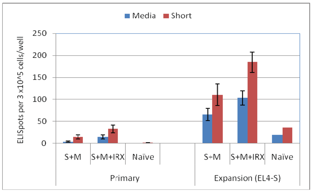 Since the immune response of the short peptide immunized mice was weak, cells from immunized mice were expanded in vitro by incubation with antigen presenting cells and IL-2 for 6 days before measuring the T cell response to the short peptide. As shown in Figure 3, expansions using peptide pulsed EL-4 irradiated cells, were effective in the short peptide immunized mice when compared to the low primary ELIspot response without in vitro expansion. Thus when the expansion protocol was used, it was possible to demonstrate that mice immunized with the short peptide with IRX-2 had a stronger T cell response than mice receiving only the short peptide in Montanide.
