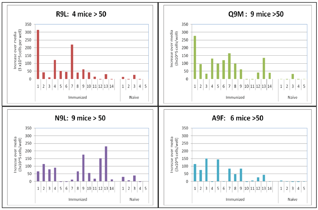 To assess whether the mice immunized with the long peptide recognized multiple epitopes, the four best scoring CTL/CD8 binding epitopes in the long peptide (Table 2) were used as target epitopes in the ELISpot assay. As shown in Figure 5 and Table 4, mice that were selected because they were positive for the long peptide (regardless of whether they received IRX2 or not) recognized multiple epitopes whether defined by the number of mice with an ELISpot response greater than media (i.e., % positive mice) or ranked by magnitude of the response (i.e., greater than 2 × the naïve mouse controls; >50 ELISpots). While the response rate ranged from 28%–64% for the individual peptides, the overall response rate as defined by a response to at least one of the peptides was 86%