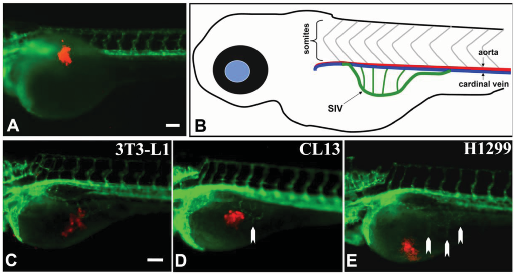 We transplanted CM-DiI dye labeled H1299, CL13, and 3T3-L1 cells, as described [11], at the superficial location of the yolk near to the perivitelline space of the embryos at 1 dpf. One hour after transplantation the embryos were sorted; embryos whose CM-DiI fluorescence pattern indicated that cells had escaped from the primary site of transplantation were discarded. To attain the optimal visualization, we used the Tg(flk1:GFP) transgenic zebrafish line, which expresses green fluorescent protein (GFP) under the flk1/vegfr2 promoter (an early endothelial marker), and exhibits a green fluorescent vasculature [24] in transparent casper zebrafish line [25]. We also used whole-mount alkaline phosphatase (AP) vessel staining for easier quantitative measurement without time constraint during documentation using digital imaging and microscopy.