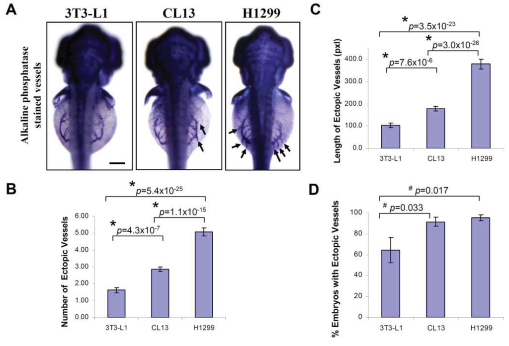 We observed a significant increase in the number of ectopic vessels (Figure 3B; H1299: 5.07 ± 0.24; CL13: 2.86 ± 0.15; 3T3-L1: 1.62 ± 0.16) and the length of ectopic vessels (Figure 3C; H1299: 379.1 ± 25.6; CL13: 178.4 ± 11.3; 3T3-L1: 104.3 ± 9.24, unit in pixels) with H1299 cancer cells implantation compared to CL13 implantation. In addition, both of these cancer cells imposed significant difference in length and number of ectopic vessels in comparison to 3T3-L1 control. On the other hand, the percentage of embryos with ectopic vessels is obsolete and not a reliable parameter to distinguish subtle difference between different cancer cells. Although we also observed a significantly greater percentage of embryos with newly formed ectopic vessels in cancer cell transplanted embryos (Figure 3D; H1299: 95.3 ± 2.9%; CL13: 91.6 ± 4.2%) compared to the 3T3-L1 fibroblast injected controls (3T3-L1: 64.2 ± 12.0%). This parameter cannot be used to distinguish between H1299 and CL13 cancer cells.