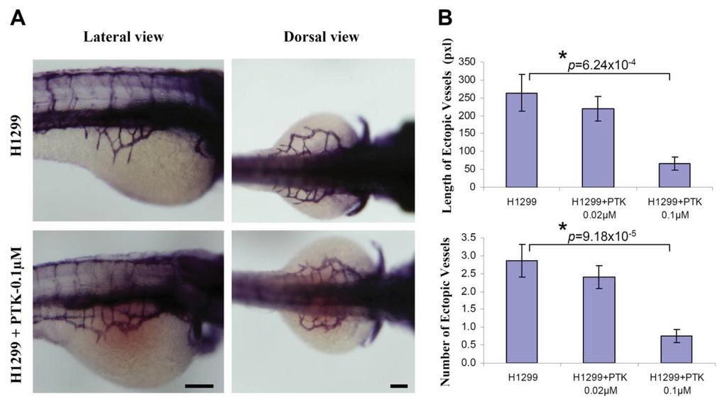 To determine the efficacy of zebrafish xenotransplantation in testing the known protein tyrosine kinase inhibitor (PTK787, a pharmacological inhibitor of VEGF receptor tyrosine kinase) quantitatively on tumor angiogenesis, H1299 cells were fluorescently labeled with CM-DiI and implanted near to the perivitelline space. Immediately, after implantation, the embryos were systemically exposed to 0.1 μM PTK 787 through 3 dpf. By using whole-mount alkaline phosphatase (AP) staining, it was observed that incubation of the H1299 implanted embryos with PTK787 significantly inhibited the H1299-induced number (H1299: 2.87 ± 0.46; H1299+PTK787/0.02 μM: 2.41 ± 0.32; H1299+PTK787/0.1 μM: 0.76 ± 0.18) and the length (Figure 4B; H1299: 264.1 ± 50.9; H1299+PTK787/0.02 μM: 219.8 ± 33.5; H1299+PTK787/0.1 μM: 66.4 ± 17.6) of the ectopic vessels sprouting from the SIV (Figure 4).