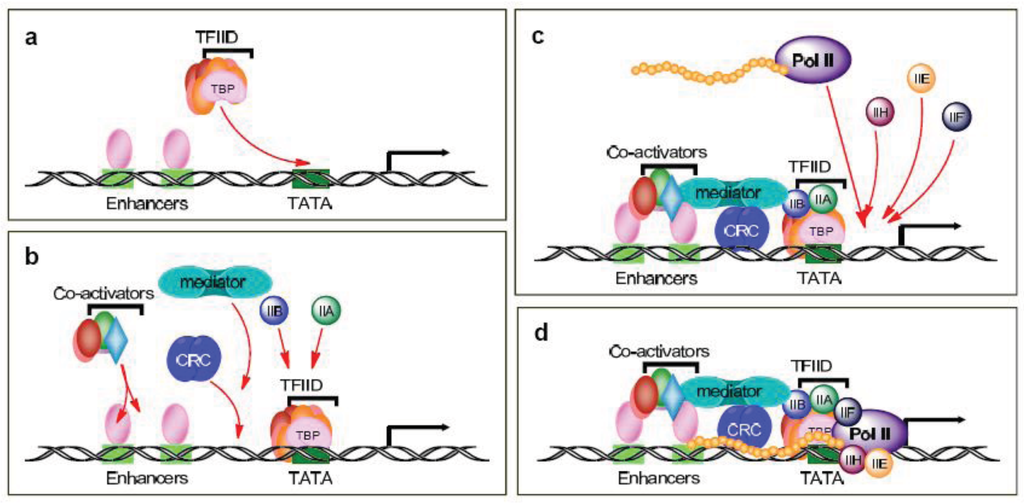Following the activators and/or TFIID recruitment, in the traditional scenario, the chromatin remodeling complexes (CRC), the Mediator and other coactivators, as well as TFIIA and TFIIB, are recruited to the pre-initiation complex (Figure 1b). The Mediator bridges the interactions between the activators and the basal initiation machinery and, for the most part, is required for transcription activation. It is composed of at least 24 subunits and the varied subunit composition of the Mediator also allows for cell-type- and promoter-specific transcription. TFIIA is composed of two subunits and behaves as a coactivator and counteracts the repressive effects of negative cofactors. TFIIB is a single subunit that stabilizes TFIID-promoter binding and provides accurate start site selection and direction of transcription.