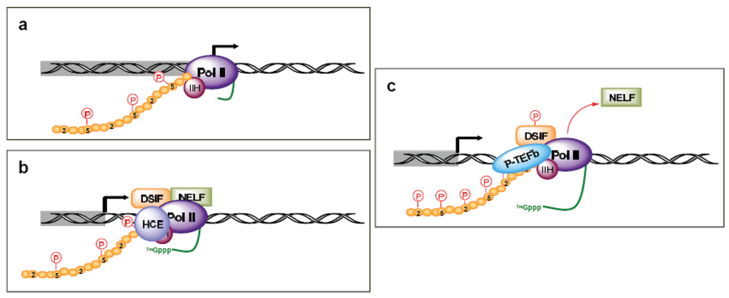 After the first 25–30 nucleotides are transcribed, there is a transition between transcription initiation and elongation [17-20]. This is marked by several events, including the enhanced stability of the DNA-RNA-transcription machinery, promoter release, binding of elongation factors, and the hyperphosphorylation of the Pol II CTD. This process also coordinates the first pre-mRNA processing reaction by arresting Pol II at a “checkpoint”. This Pol II arrest is accomplished through TFIIH kinase activity promoting the recruitment of 5,6-dichloro-1-β-d-ribofuranosylbenzimidazole (DRB) sensitivity-inducing factor (DSIF) and negative elongation factor (NELF) (Figure 2b). The pause in Pol II activity allows for the addition of the 7-methyl G5′ppp5′N cap structure to the RNA transcript, which aids in stability, splicing, nuclear export, and translation [20]. The human capping enzymes (HCE) associate physically with the Ser5 phosphorylated CTD. Release from the checkpoint involves the kinase activity of P-TEFb, which includes Cdk9 coupled with cyclin T. P-TEFb is recruited by the capping enzymes and phosphorylates DSIF (Figure 2c). This leads to the release of NELF and relieves Pol II pausing, though there is gene specificity in this process as well [21]. Additionally, P-TEFb phosphorylates the Pol II CTD Ser2, which coordinates both transcription elongation and termination. CTD Ser2 phosphorylation recruits elongation factors, such as CRC, as well as splicing complexes [18].