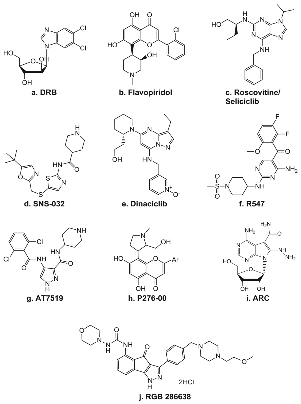R547 (Figure 4f) is a diaminopyrimidine that is highly specific against CDK 1, 2, 4, 7, and 9 [83] and has recently completed testing in a phase 1 clinical trial. Phase II trials in advanced solid tumors and hematologic malignancies are being planned. P276-00 (Figure 4h) is a rohitukine derivative. It was found to be highly selective for cancer cells as compared with normal fibroblast cells, as nM quantities readily inhibited the growth of several colon cancer as well as osteosarcoma, leukemia, breast, cervical, prostate, bladder, and lung cancer cell lines but not of two different normal lung fibroblast cell lines [85]. In multiple myeloma cells, P276-00 cytotoxicity also correlated with inhibition of Pol II CTD Ser2 phosphorylation, decreased growth, and inhibition of survival proteins such as MCL-1 and cyclin-D1 [107]. P276-00 is currently in clinical trials in combinational studies.
