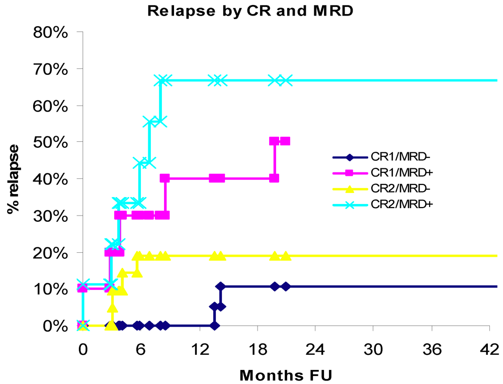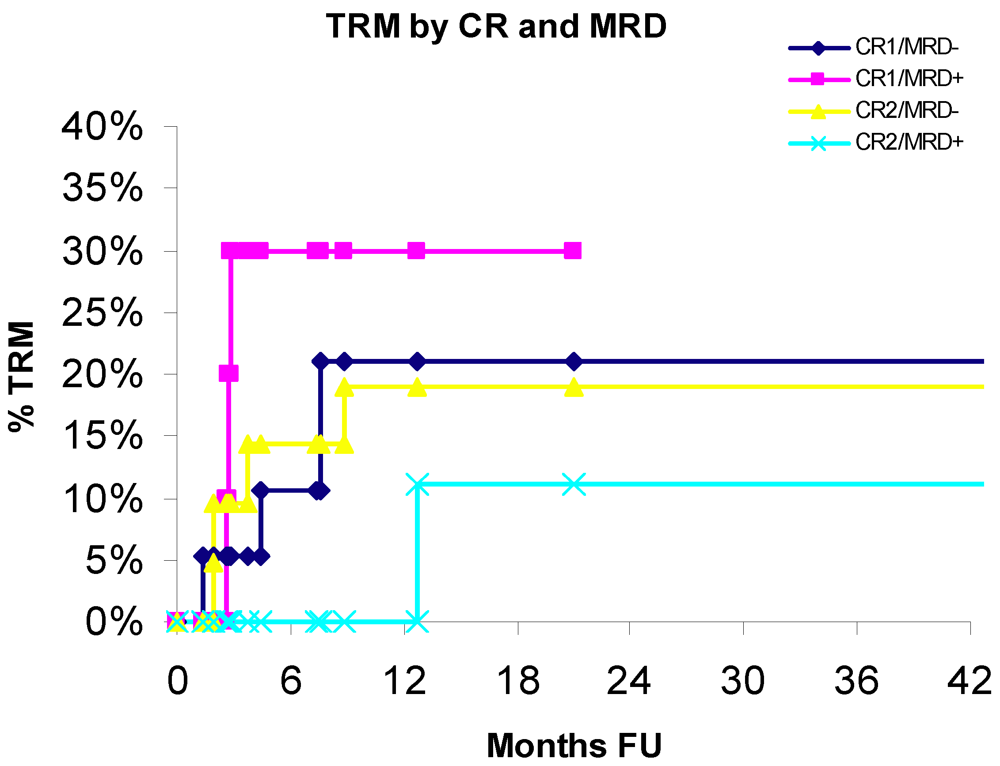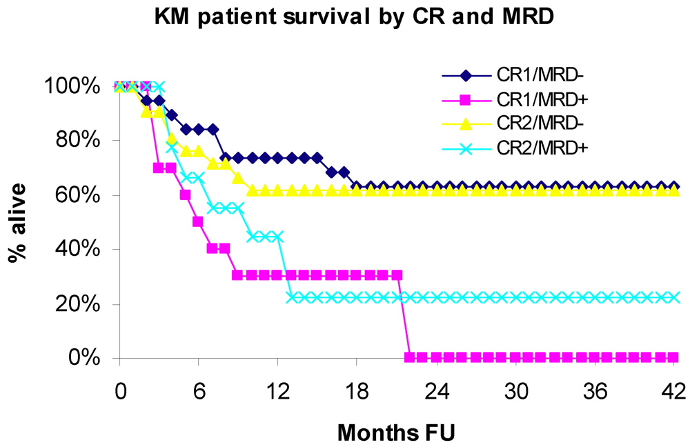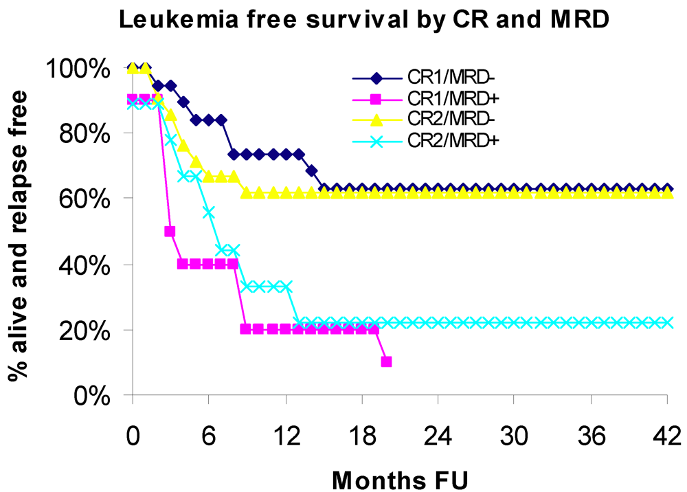 Each patient evaluable for this study underwent bone marrow (BM) biopsy prior to transplant, and the BM samples were further investigated for persistence of MRD. All BM aspirates and biopsy samples were analyzed at the UCLA Department of Pathology and Laboratory Medicine. For the MRD assessment we used multiparameter flow cytometry, cytogenetics and fluorescent in situ hybridization (FISH). Cytogenetics and FISH analyses were performed according to the standard protocols. In flow cytometry, residual tumor cells were detected using immunofluorescence of surface markers. A panel of at least three antibodies selected on the basis of the immunophenotype of the original leukemia was used. MRD was identified as a cell population showing deviation from normal antigen expression patterns compared with normal or regenerating marrow. Any level of residual disease was considered MRD positive. Patients who had tissue involvement (leukemia cutis) with negative bone marrow were also considered for MRD assessment (patient #52).