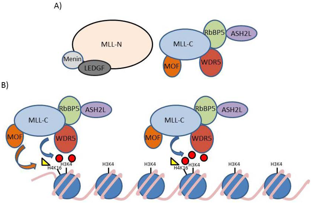 MLL multiprotein complex. (A) MLL is present in the cell as part of a large protein complex. MLL-C is associated with the WDR5, RBBP5, ASH2L and MOF proteins. MLL-N interacts with a wide range of different proteins, for simplicity only menin and LEDGF are shown; (B) The model proposed by Wysocka et al. and Dou et al.: WDR5 recruits the MLL complex to H3K4me2 allowing the addition of another methyl group to histone H3 lysine 4 and acetyl group to histone H4 lysine 16. Additional MLL complexes are then recruited to target genes or existing MLL complexes are transferred to the next nucleosome [95,114]. The yellow triangle represents an acetyl mark, while red circles represent methyl marks. Figure adapted from [114].