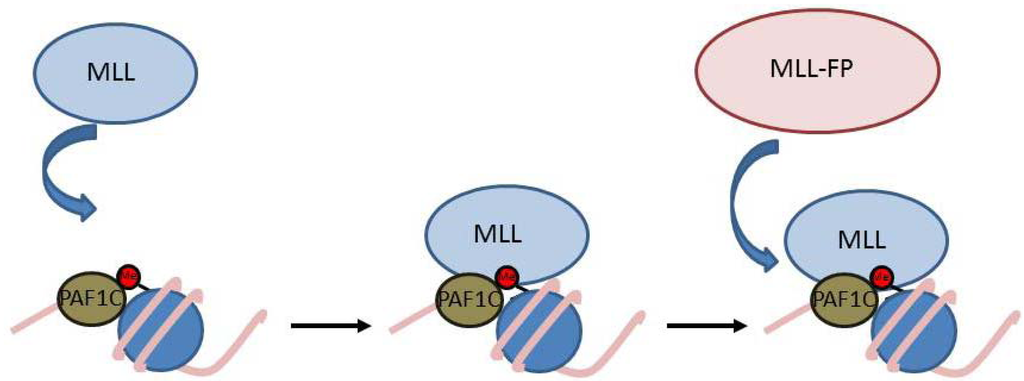Steps in recruiting MLL and MLL-FPs to the HOXA9 locus. MLL is recruited to a target gene through interactions with the PAF1 complex and H3K4Me3 which results in increased activation of the locus and a more open chromatin conformation. This allows MLL-FP to bind by interactions with PAF1C and CpG rich DNA. Red circles represent methyl marks.