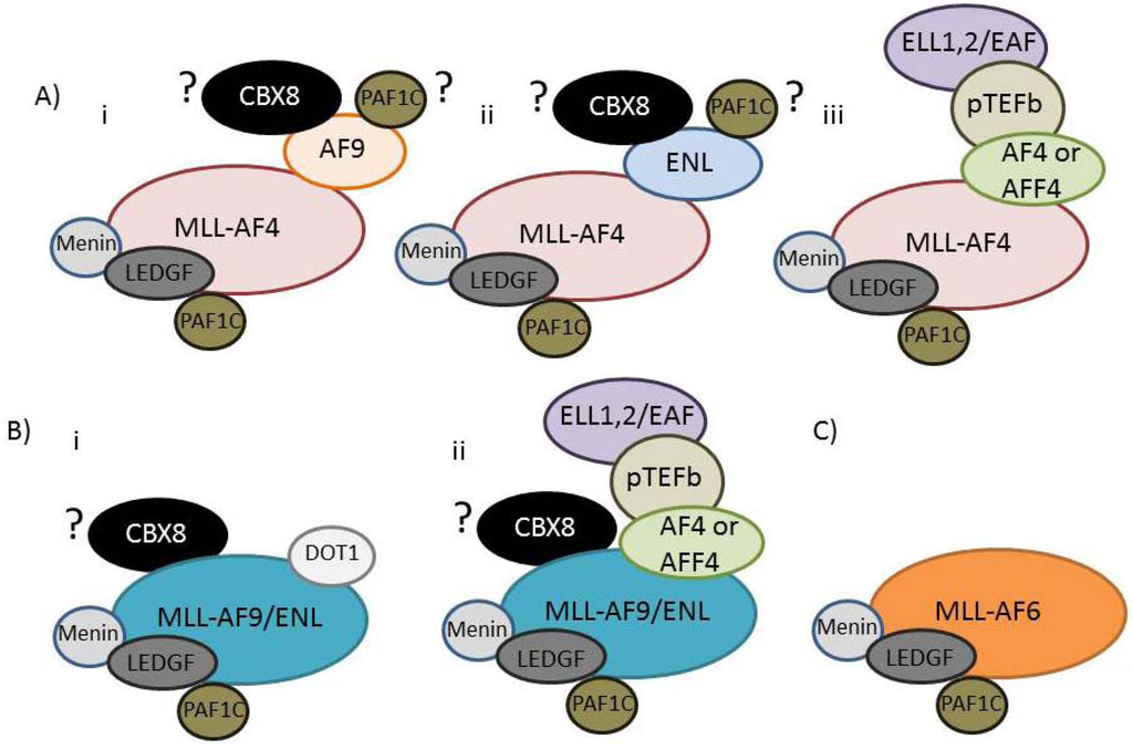 MLL-FPs are present in the cell as part of distinct multiprotein complexes. (A) The MLL-AF4 fusion protein can either bind to AF9 (i) or ENL (ii) or AF4/AFF4 (iii). CBX8 and PAF1C may also be able to interact with wild type AF9 and ENL in the context of the MLL-AF4 complexes, or they may be mutually exclusive (the uncertainty is indicated by a “?”); (B) MLL-AF9 or MLL-ENL can exist in a complex either with DOT1L or with AF4/AFF4/pTEFb/ELL/EAF. CBX8 may be part of these complexes or may be in a distinct, mutually exclusive complex with MLL-ENL or MLL-AF9; (C) MLL-AF6 is the only MLL-FP which doesn’t interact with any SEC component.