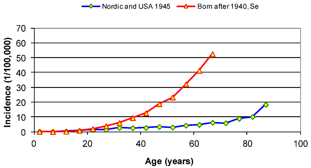 Furthermore, as shown in Figure 2, the incidence did not level off after the age of 30 as it did earlier, but continued to increase by age for all persons born after 1940.