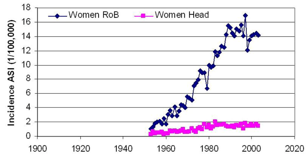 The incidence of melanoma in women in Norway roughly doubled on the head region after 1955 while it increased by almost 20 times on the rest of the body (RoB) [3].