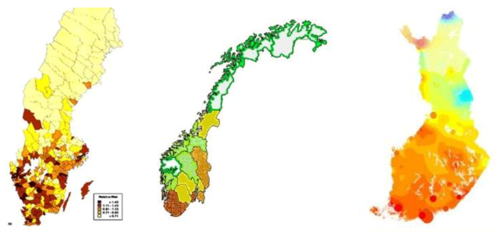 The incidence of melanoma is unevenly distributed within Nordic countries. The maps represent Sweden, Norway and Finland from left to right.