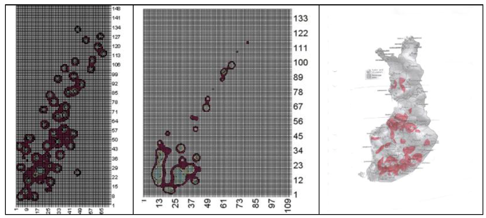 Calculated radiation levels from main broadcasting transmitters in Sweden, Norway and Finland. The first graph represents Sweden and shows areas with highest radiation levels. The second plot represents Norway, showing the highest levels in the south part of the country. The third plot gives areas in Finland covered by three or more main broadcasting transmitters (red colour).