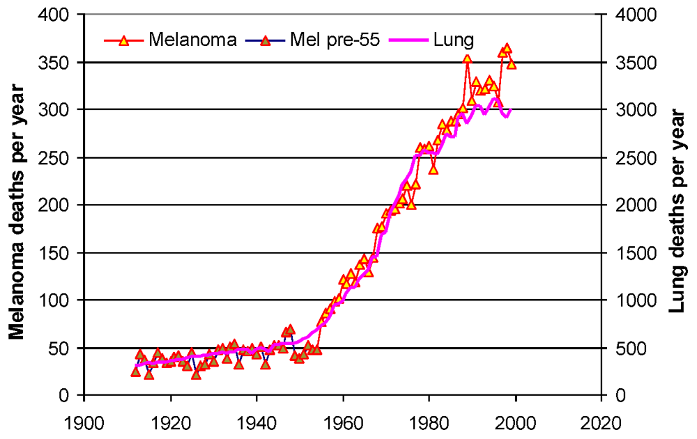 At the beginning of the 20th century, melanoma was mainly found on sun-exposed areas of the body such as on the head or sometimes even on the feet. But after 1955 melanoma increased fastest on normally non-exposed parts of the body, see Figure 3. Melanoma on the head and on the rest of the body are often different in nature, as head melanomas are invariably associated with solar elastosis and chronic sun damage to the skin. The data in Figure 3 refer to the term melanoma in general, as used in databases.