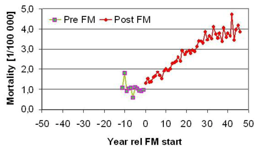As mentioned before, some counties of Sweden had to wait up to 10 years before the FM broadcasting system had been installed. It is thus interesting to see if the melanoma incidence stayed low and stable before they got the new radio or not. Figure 8 shows that this certainly was the case and is a strong argument for deeper studies.