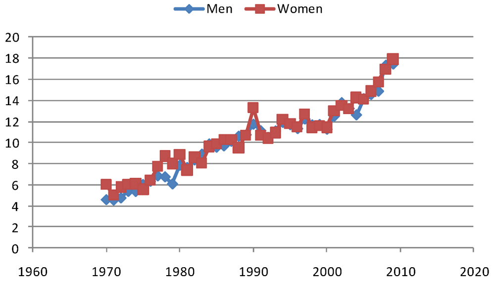 Melanoma is a disease that mainly is a problem in Western types of developed countries. In Japan e.g., the melanoma incidence is only around 3% of the Swedish level, although Japan is a modern and well developed country. In Sweden the world age-standardized rate of melanoma is today approaching 20/100,000 py (see Figure 9). The incidence seems to have been levelling off around the year 2000, but has been increasing fast since 2005. This increase during the last years cannot be due to better and more observant doctors, since the mortality also starts to increase remarkably after 2005, especially for men (see Figure 10).