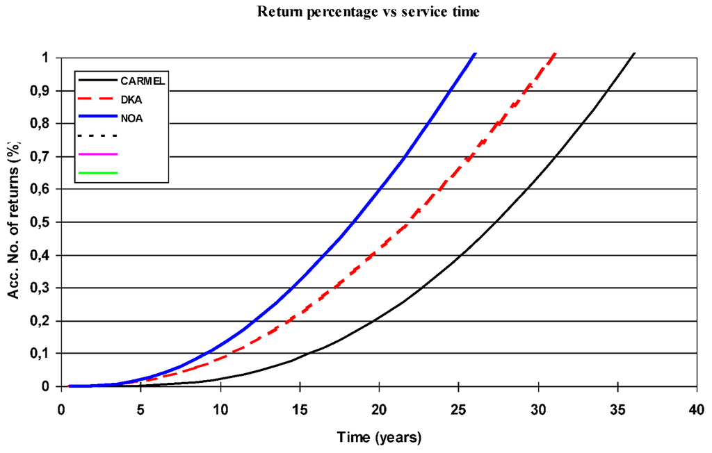 Similar sets of data were collected from Sweden, Norway and Denmark to extract their respective characteristic functions. If the hypothesis is valid, we should expect to arrive at basically one and the same function for all countries. This analysis was performed in 2002, and the result was negative; the characteristic functions were different for all countries and therefore the association between melanoma and car population can be classified as a confounder, see Figure 11, where returns (%) refer not to faulty cars but instead to melanoma cases. According to the graph 10,000 new cars in Sweden one year should have caused 0.2% or 20 melanoma cases after 20 years, as an example.