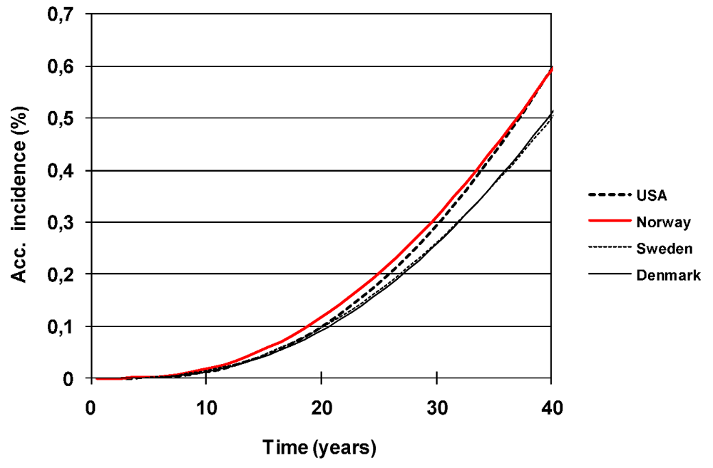 A detailed analysis of the roll-out of the FM-radio system was performed for Sweden, Norway, and Denmark and for the USA. The number of people that became exposed for the new environment per year was used in combination with data on melanoma incidence, and the characteristic function was extracted for each country. The result is shown in Figure 12, and we can note that the function became basically identical for all countries despite the fact that there were four completely different sets of data.