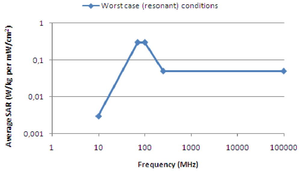 Figure 13 shows that the FM band 87–108 MHz is classified by the WHO as the most powerful frequency band when it comes to radiation absorption [9]. In their fact sheet #304 WHO states: “In fact, due to their lower frequency, at similar RF exposure levels, the body absorbs up to five times more of the signal from FM radio and television than from base stations. This is because the frequencies used in FM radio (around 100 MHz) and in TV broadcasting (around 300 to 400 MHz) are lower than those employed in mobile telephony (900 MHz and 1800 MHz) and because a person's height makes the body an efficient receiving antenna. Further, radio and television broadcast stations have been in operation for the past 50 or more years without any adverse health consequence being established”.