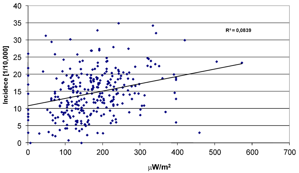 In all three countries melanoma seems higher in coastal areas and especially in the southern parts. These areas are also more densely populated and urban compared to the more rural areas up north showing low melanoma incidence. Urban areas also include more cars and in general more environmental pollution. These areas are also more exposed to electromagnetic radiation from different sources than rural areas are. Figure 5 shows a plot of the radiation from main broadcasting transmitters in Sweden that to some extent looks similar to the melanoma map in Figure 4. The same applies also to Norway and Finland.
