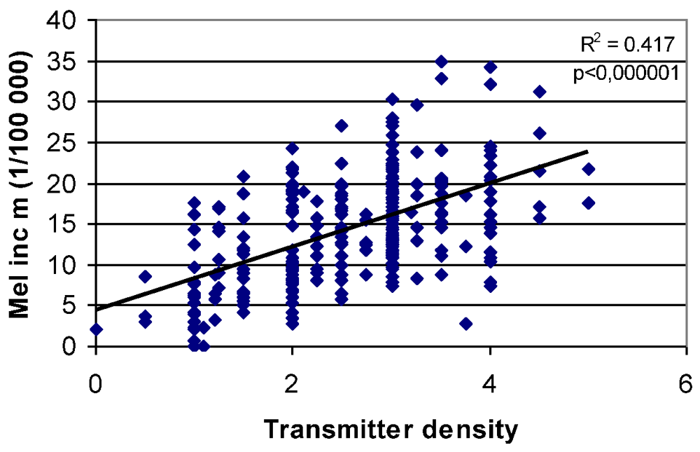 If it mainly is the power density that determines the melanoma risk, we should then expect to find the highest melanoma rates in areas receiving the highest combined power density from surrounding main transmitters. Software was developed to calculate this power density over a country, see examples given in Figure 4 for Sweden and Norway. The calculated power densities were then correlated with reported melanoma rates in Figure 14. As can be seen, the correlation is very weak and the power density can be dismissed as a main factor for melanoma.