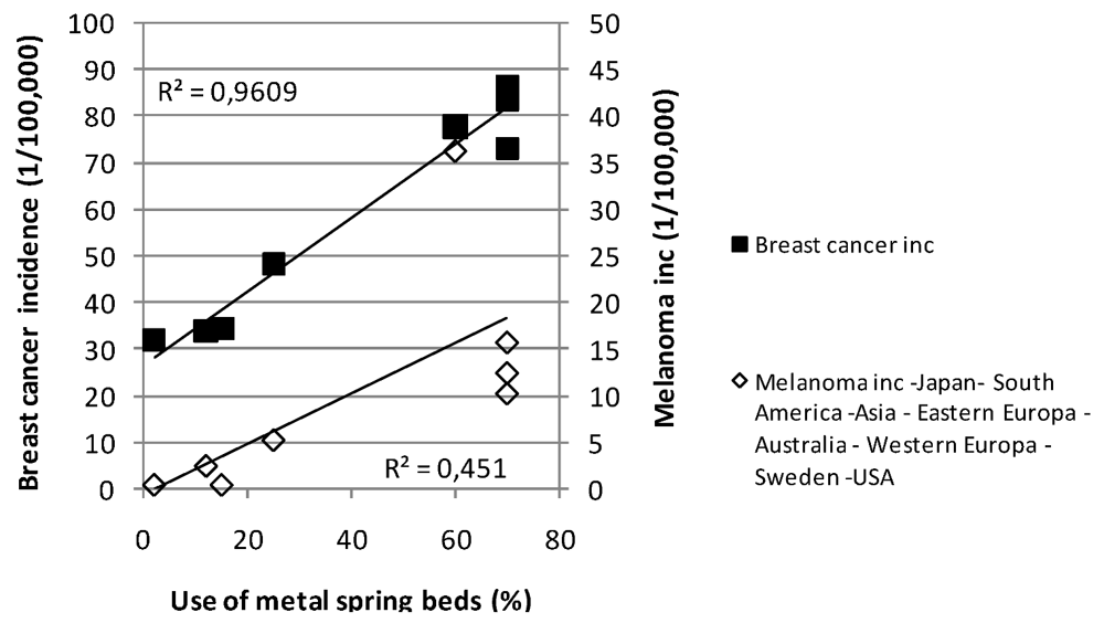 Melanoma and breast cancer incidence vs. the use of metal spring beds in different parts of the world, from [11].